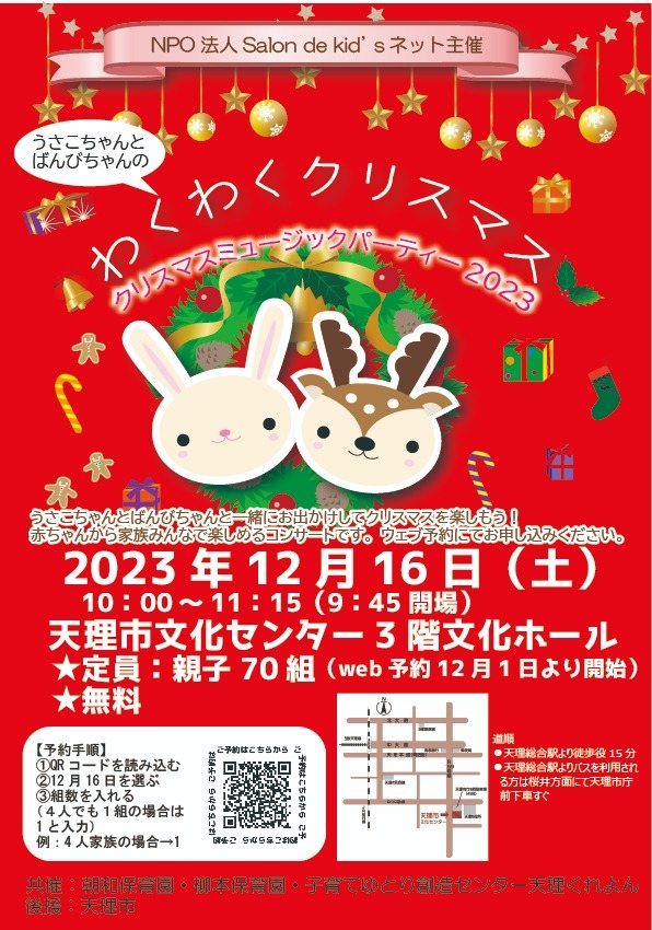 令和5年12月16日(土)天理市文化センター3階ホールにて4年ぶりにサロンドキッズのミュージックパーティーを開催しました!コロナ禍では、オンラインでのコンサートでしたが、久々の対面でのコンサートでしたが、お父さん、お祖父さんやお祖母さんたちも大勢参加していただき、とても楽しクリスマスコンサートを開催できました。ありがとうございました。