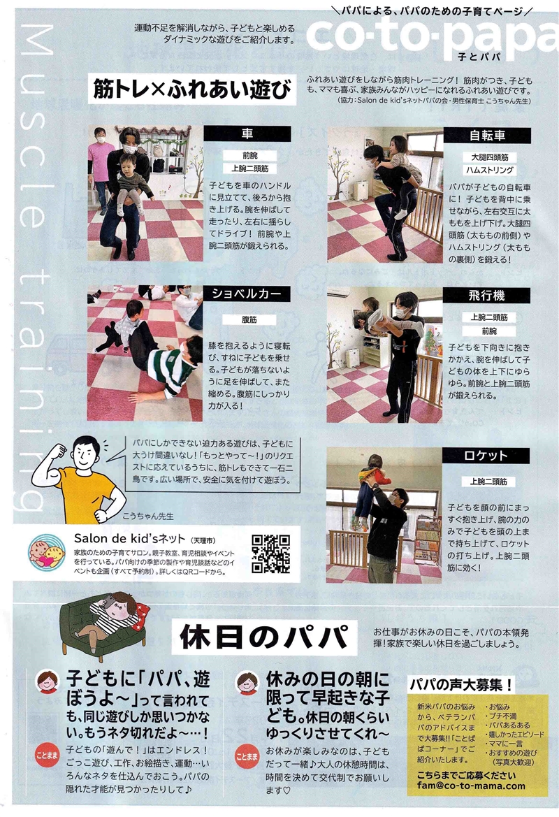 ことまま2023年1、2月号にこうちゃん先生の筋トレ×ふれあい遊びが掲載されました。 パパによる、パパのための子育てベージ co−to−papaにて掲載されました。運動不足を解消しながら、子供どもと楽しめるダイナミックな遊びとして紹介されました。