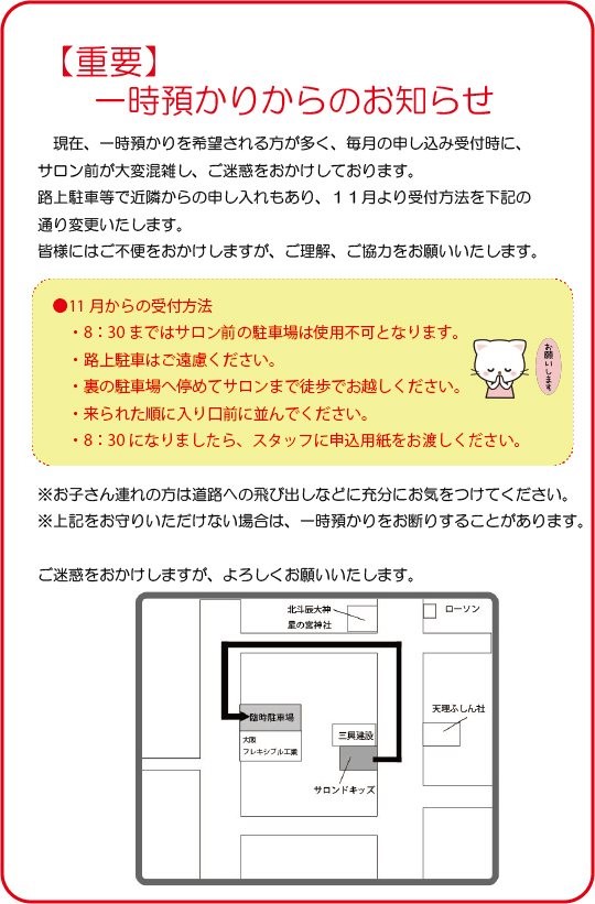 【重要】現在、一時預かりを希望される方が多く、毎月の申し込み受付時に、サロン前が大変混雑し、ご迷惑をおかけしております。